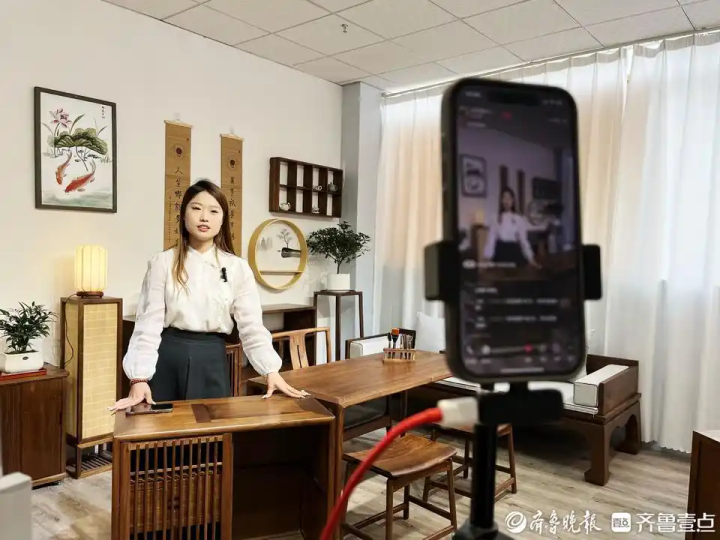 在张大庄镇家具产业园区数字化直播间,德木小匠的直播员正在给网友讲解在售桌椅的特点,后台数据不断刷新,AR虚拟展厅让买家实时操控产品360度展示。直播时间为每天上午9点到下午3点,即使是家具网销的淡季,但实际成交额仍然比较可观。