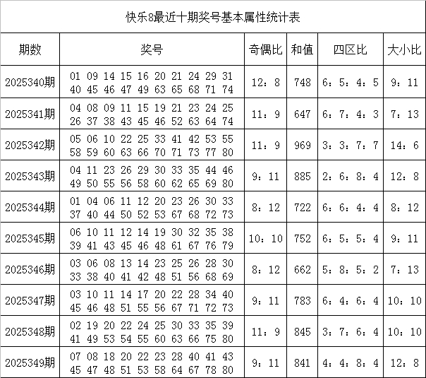 韩侠快乐8第2025350期奖号属性分析